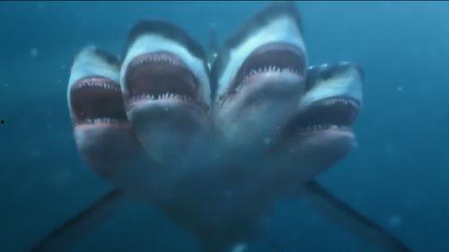 电影中,科学家们深入海底,使用先进的设备对三头鲨进行观察和研究。他们发现,这种生物拥有三个头,每个头都能独立思考,这使得它们在捕猎时更加狡猾和致命。